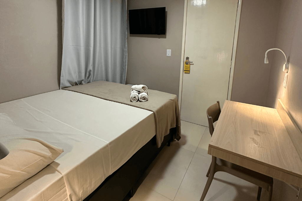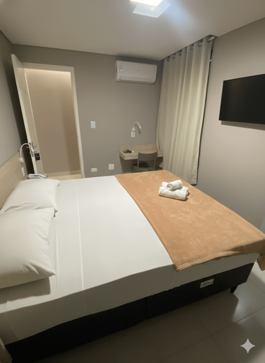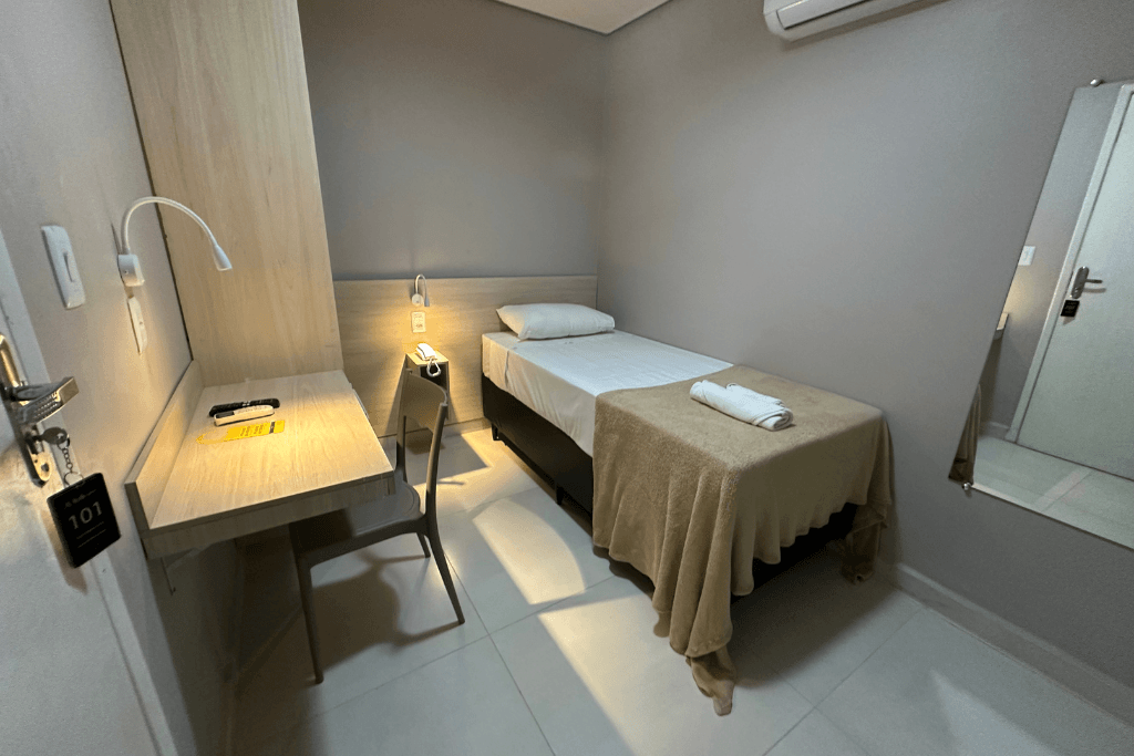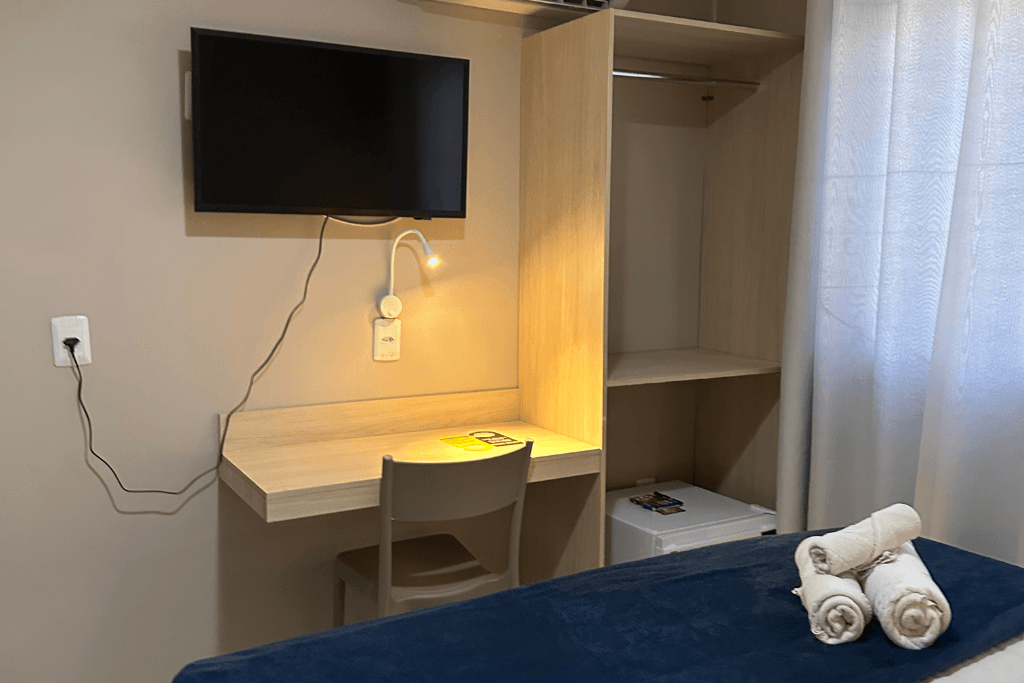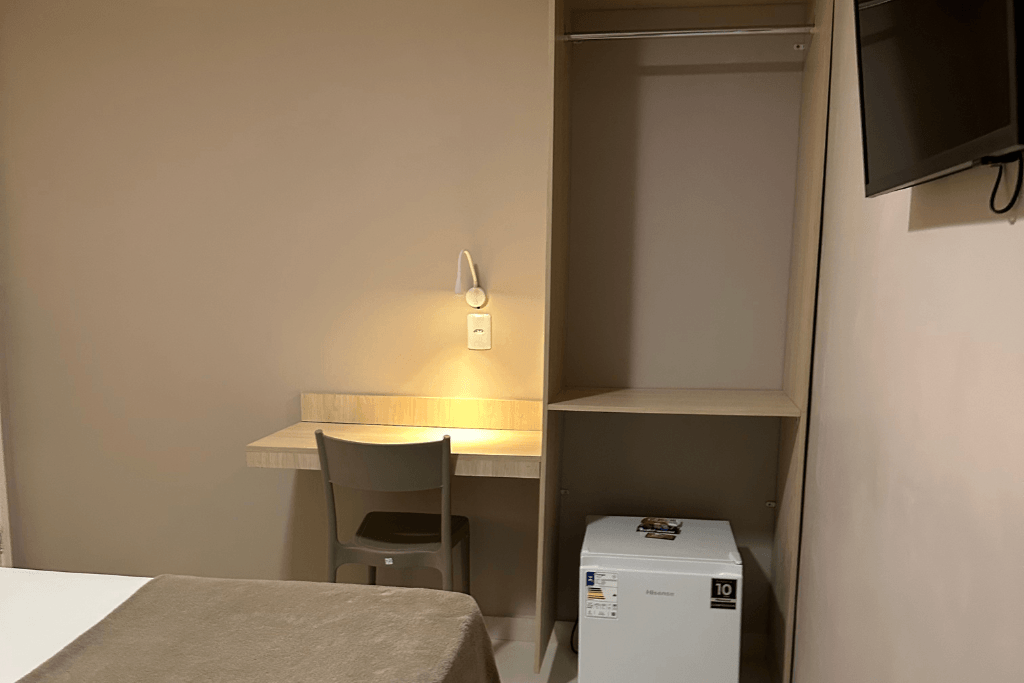 O quarto compacto e confortável conta com frigobar, ar-condicionado, TV e wi-fi, oferecendo praticidade e funcionalidade para o dia a dia. Dispõe ainda de guarda-roupa, banheiro privativo, mesa de estudos e um ambiente agradável, ideal para quem está em rotina profissional ou acadêmica.
