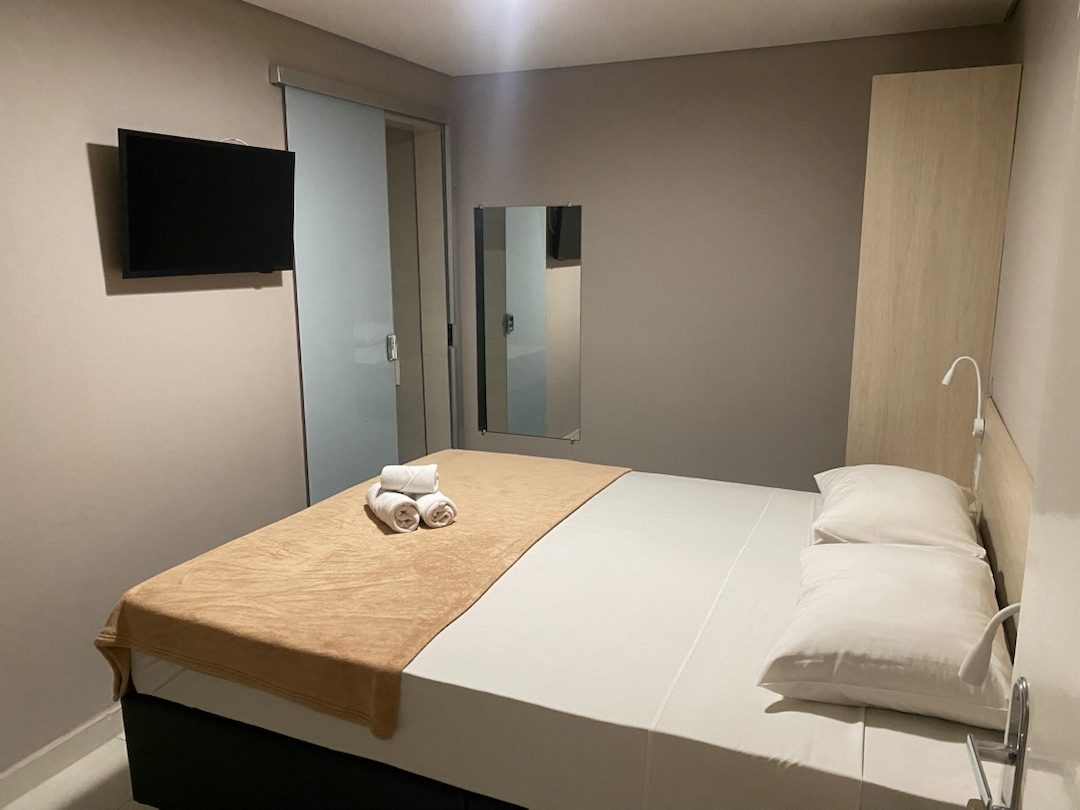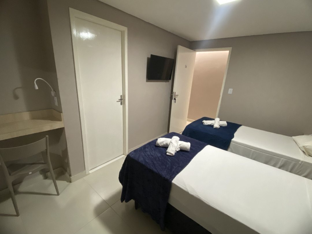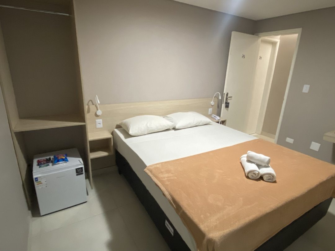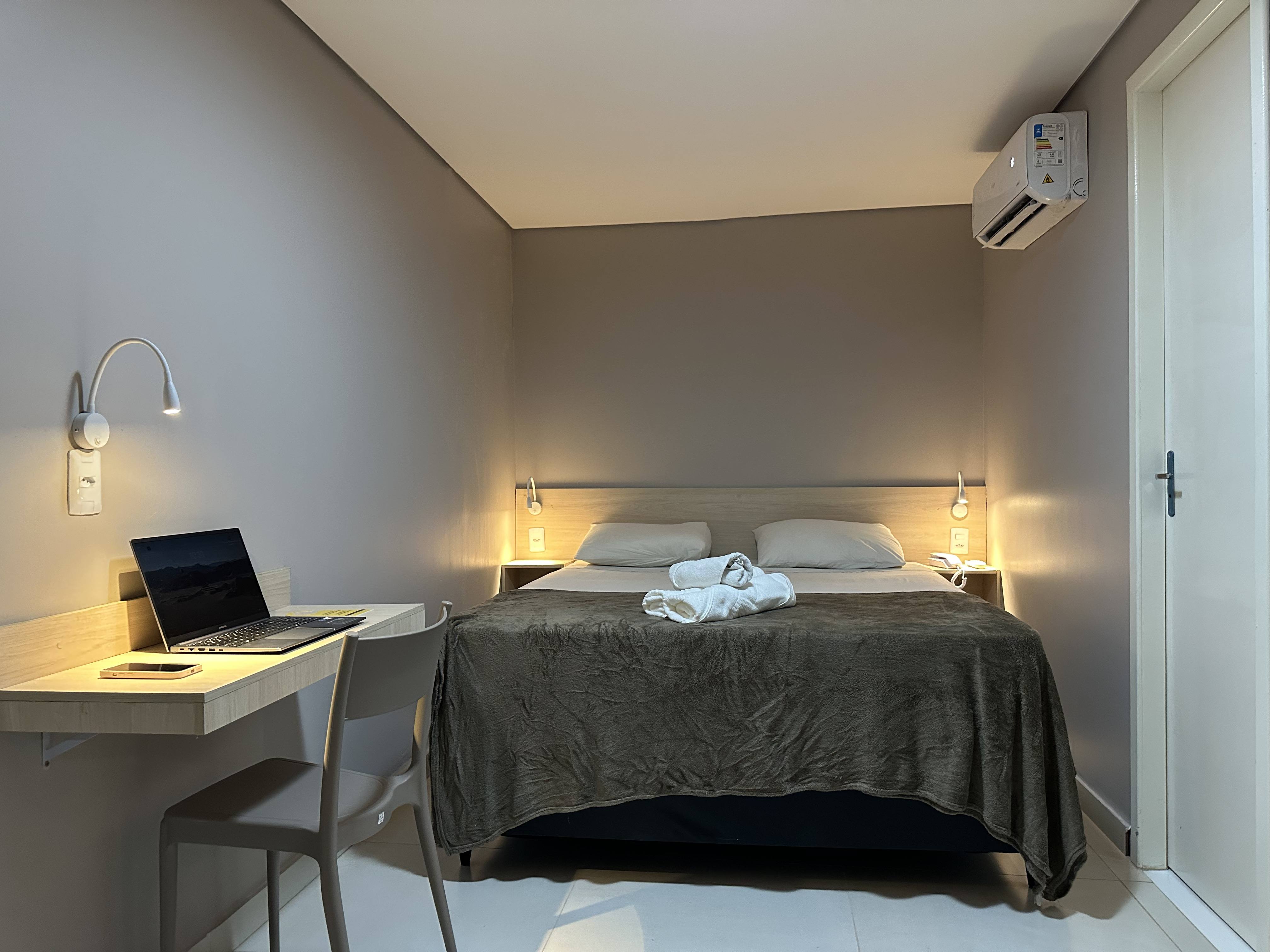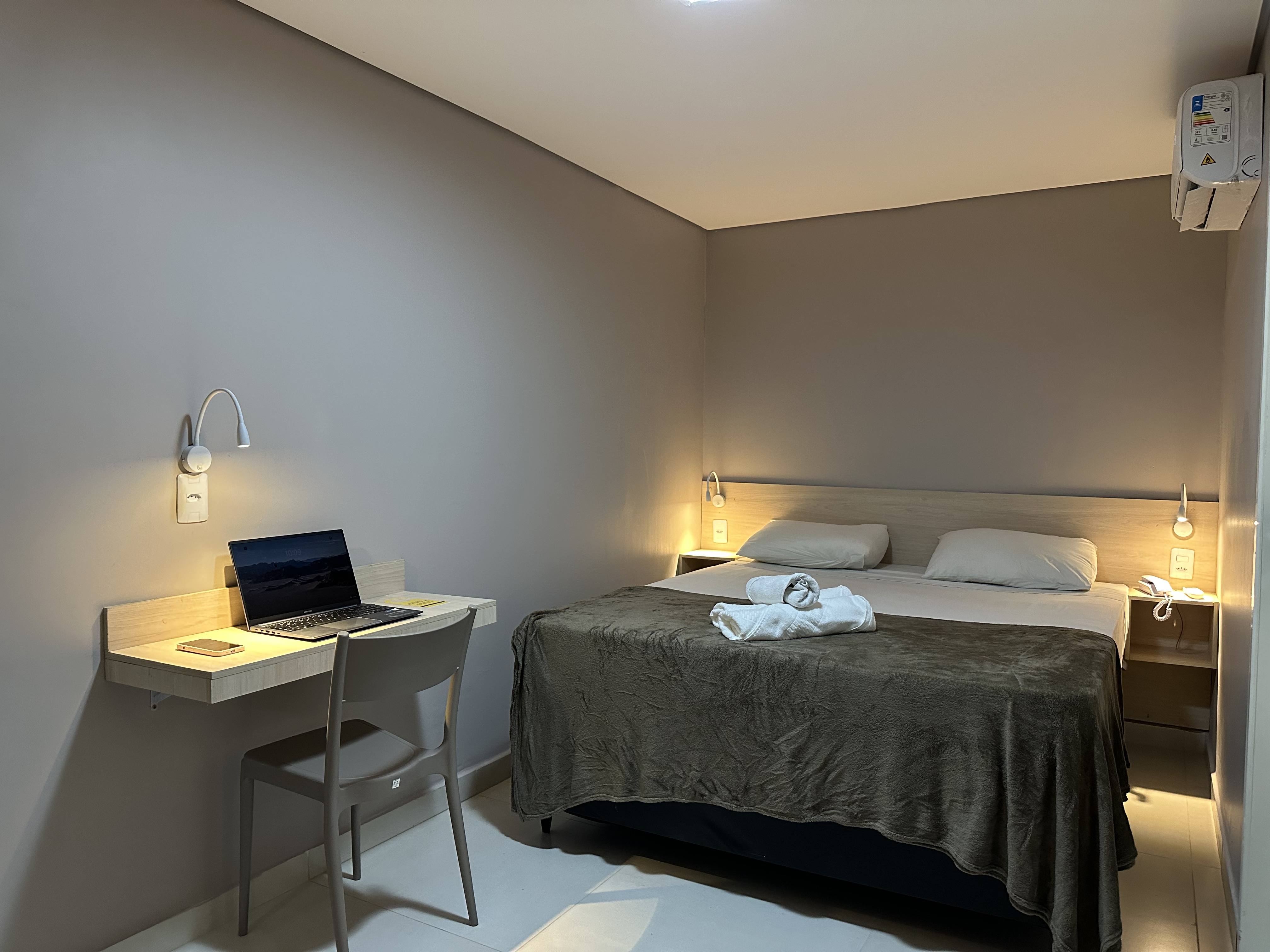 O quarto compacto e confortável conta com frigobar, ar-condicionado, TV e wi-fi, oferecendo praticidade e funcionalidade para o dia a dia. Dispõe ainda de guarda-roupa, banheiro privativo, mesa de estudos e um ambiente agradável, ideal para quem está em rotina profissional ou acadêmica.
