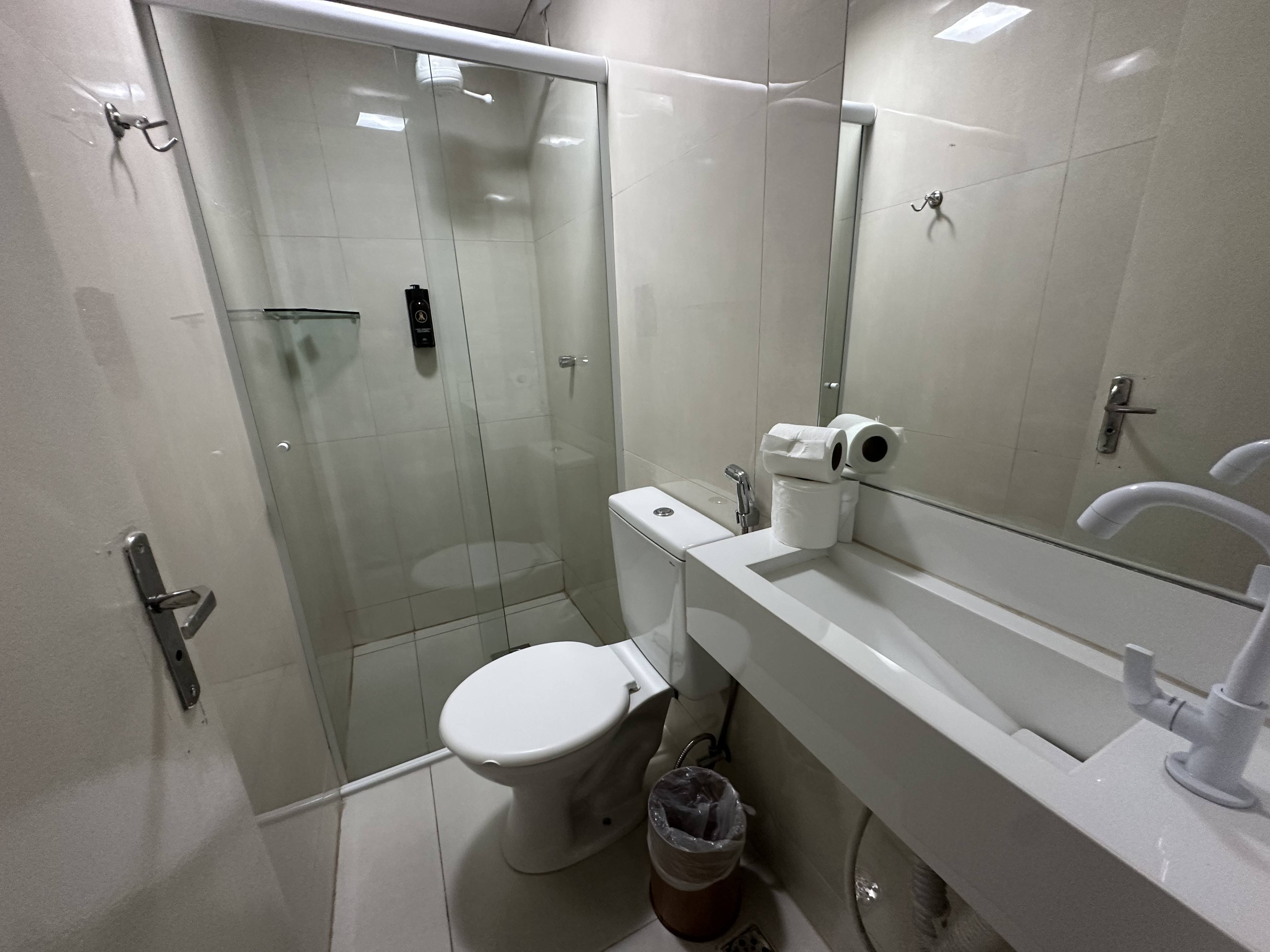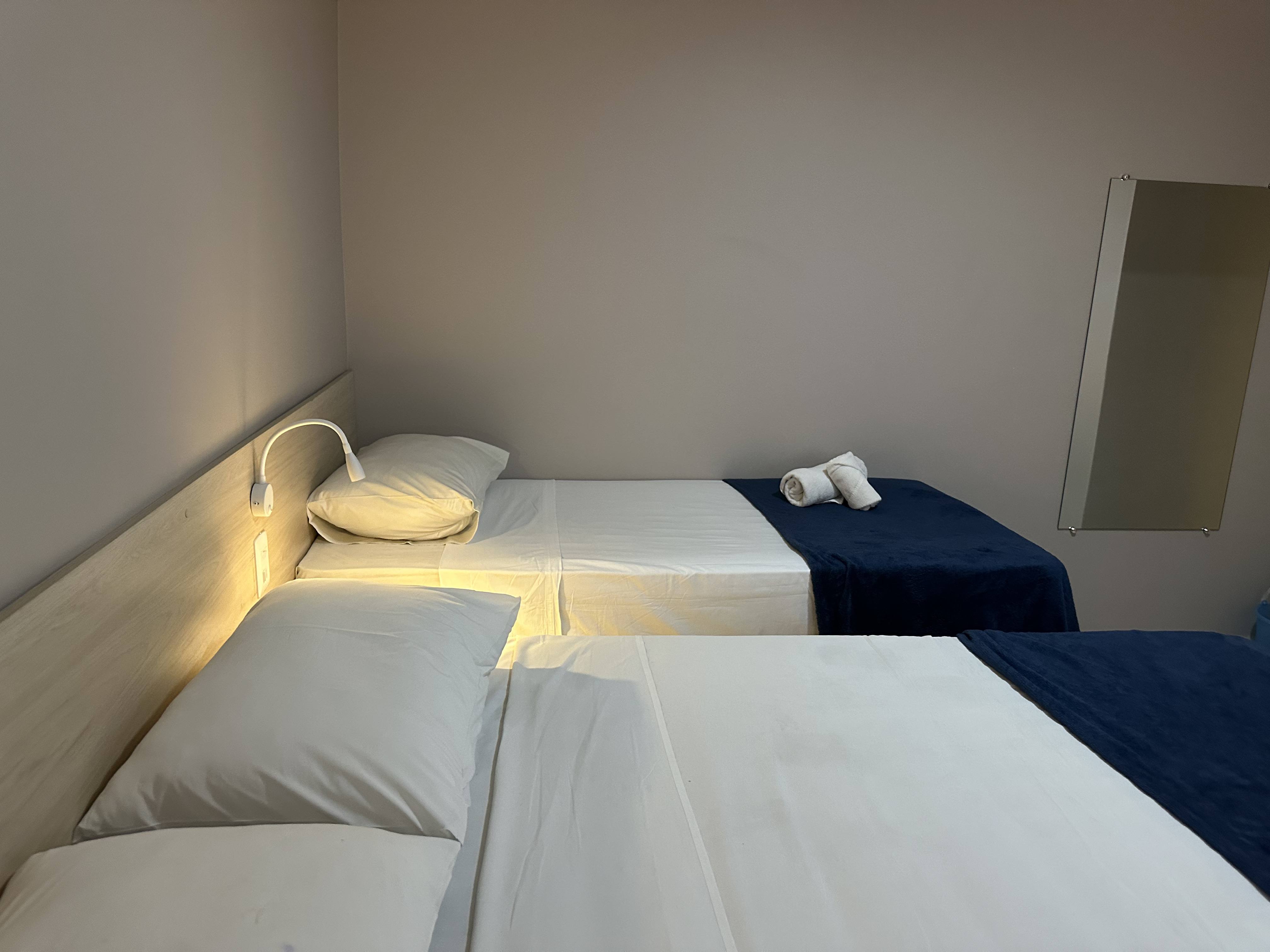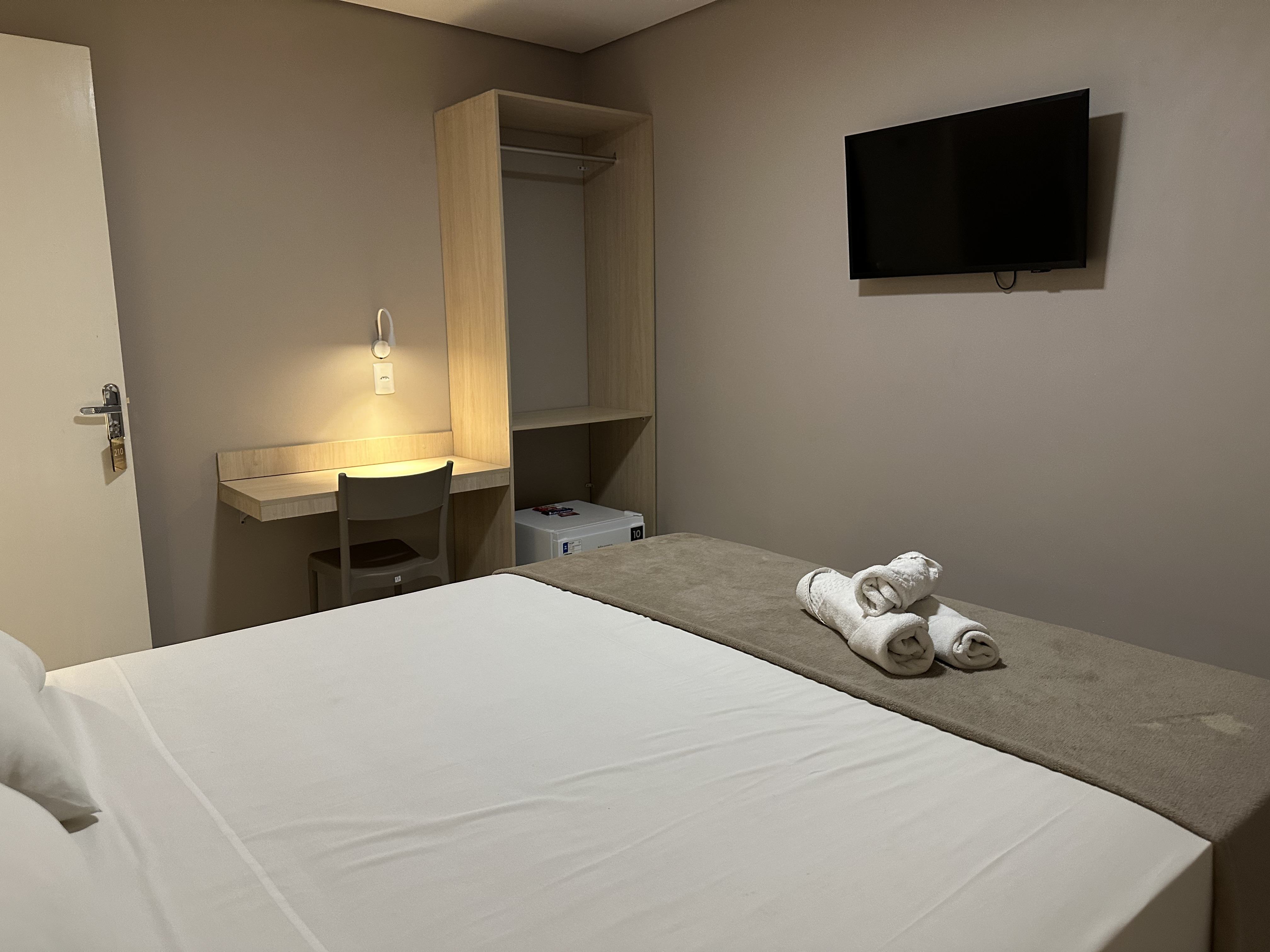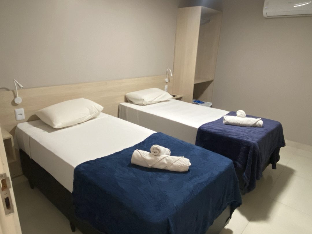 O quarto compacto e confortável conta com frigobar, ar-condicionado, TV e wi-fi, oferecendo praticidade e funcionalidade para o dia a dia. Dispõe ainda de guarda-roupa, banheiro privativo, mesa de estudos e um ambiente agradável, ideal para quem está em rotina profissional ou acadêmica.